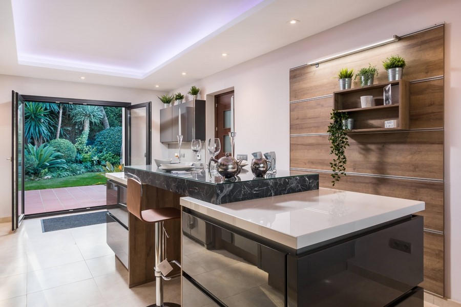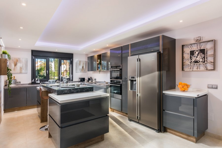 Brand New fully fitted Modern High spec German Kitchen which is very large Light and spacious , with all top modern appliances, with a Double American Fridge freezer, special mood lighting with central isle seating area with direct access to the Garden and Barbecue area.