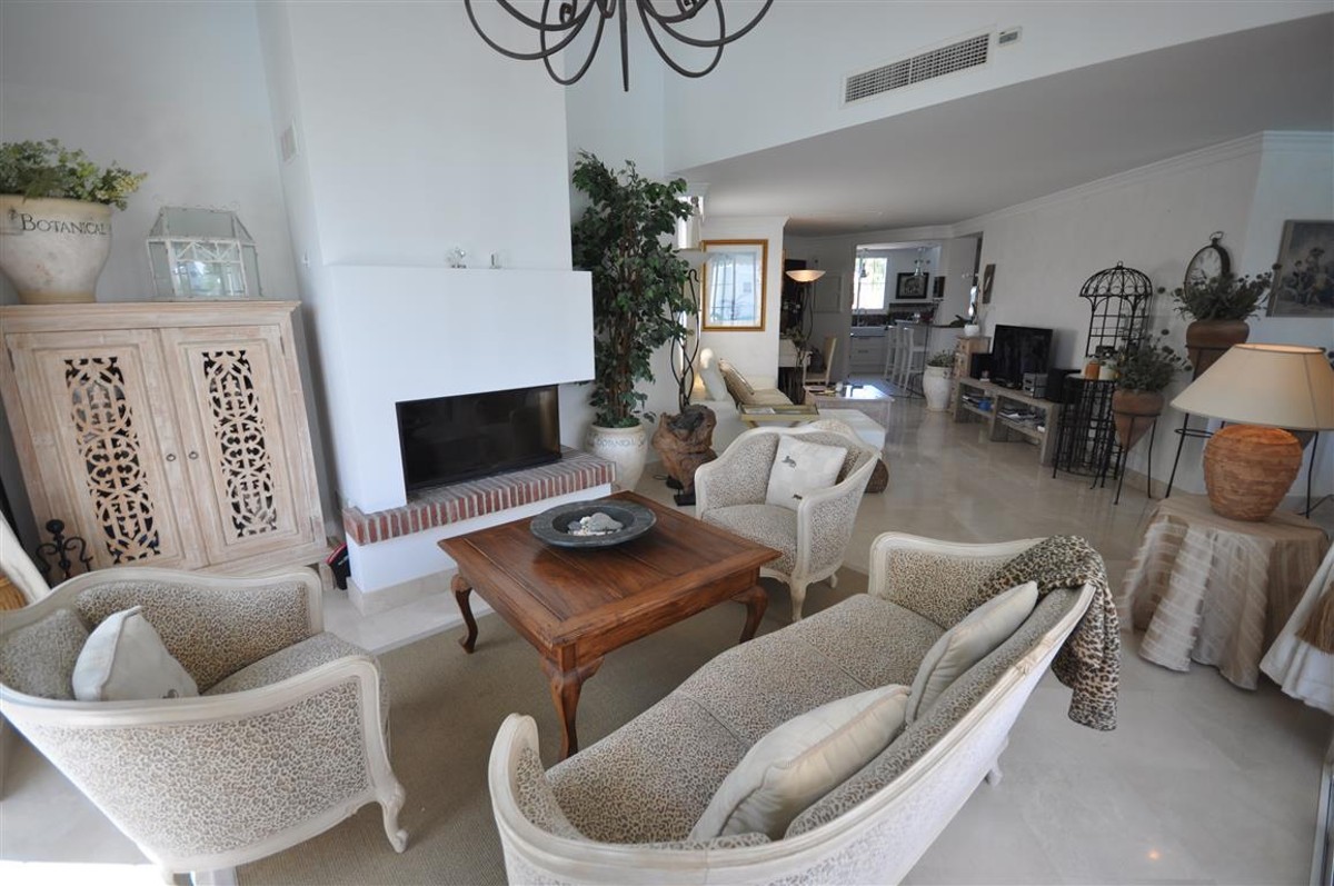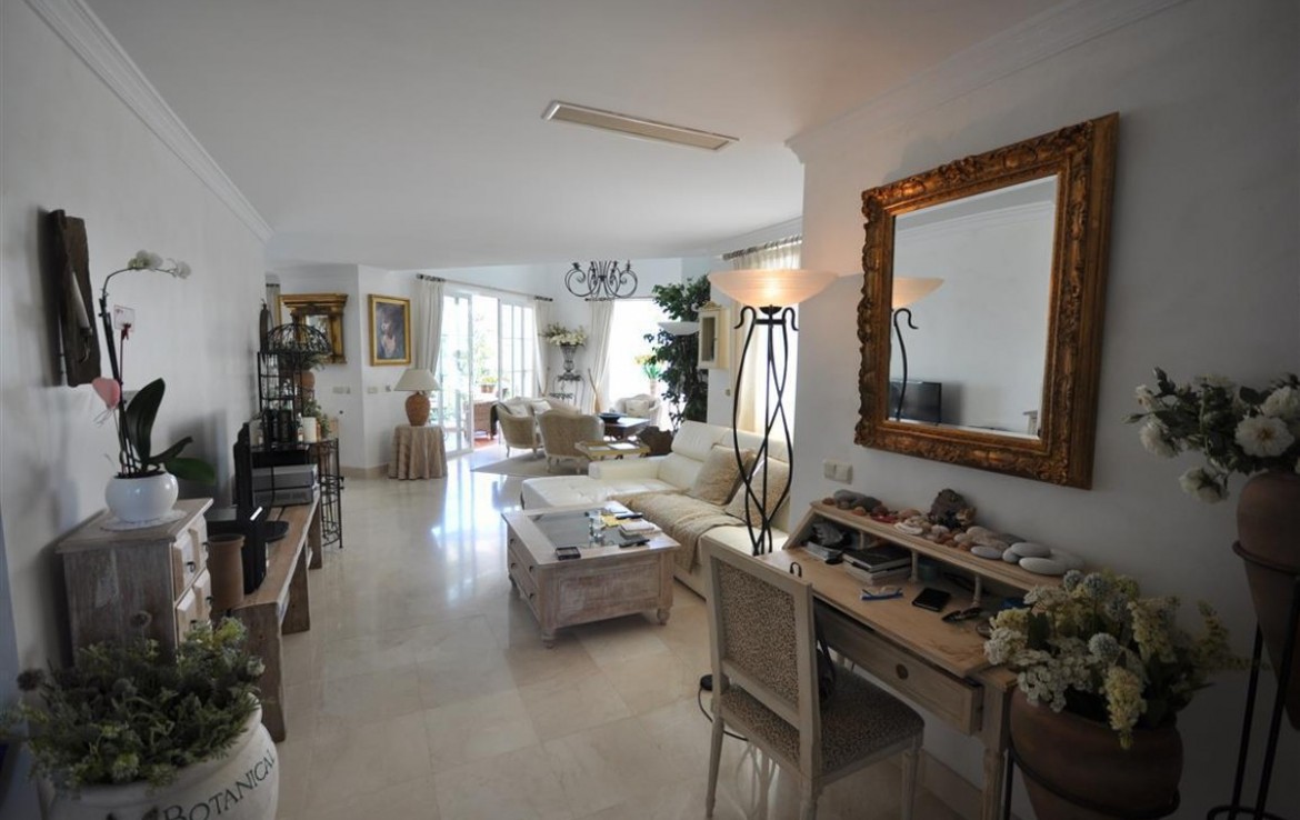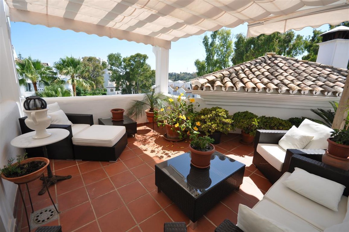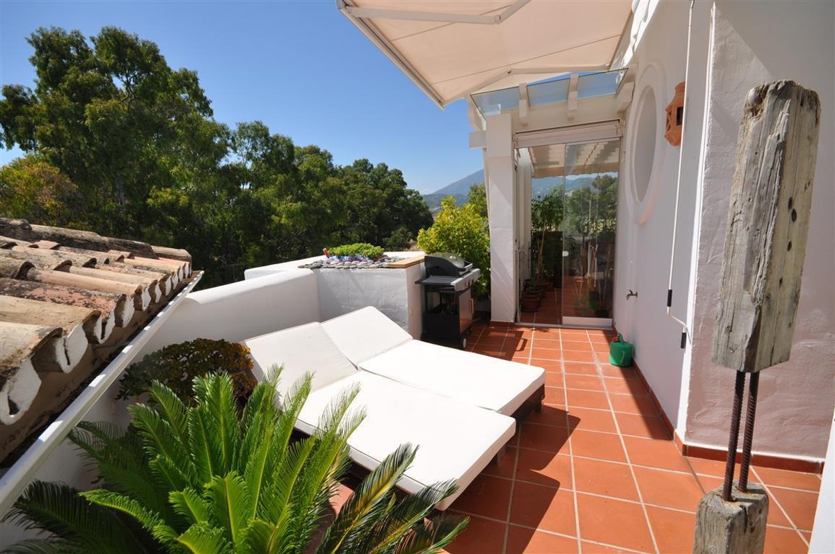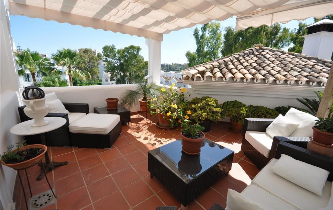 Magnificent corner duplex penthouse apartment. Very light and spacious, enjoying the sun from morning to evening and the beautiful views over the garden and swimming pool. The apartment has been completely reformed using good quality materials combined with exquisite taste. Large open plan kitchen and a spacious living room, with modern fireplace. Plenty of terrace space on the 1st floor, small bodega, 2 bedrooms and 2 bathrooms. On the 2nd level is a large master bedroom with en suite, all surronded by large terraces with shade, some of them with glass curtains. The property is located in a well mantained urbanization with 24h. security, walking distance to the town center and only a very short walk from the club house of Gualdalmina Golf. Under ground parking included.