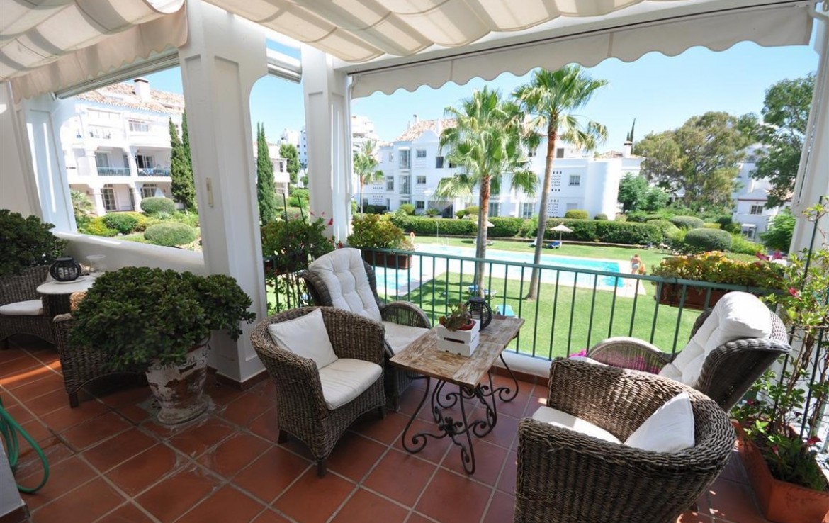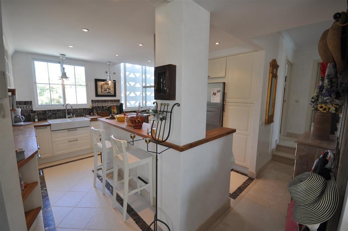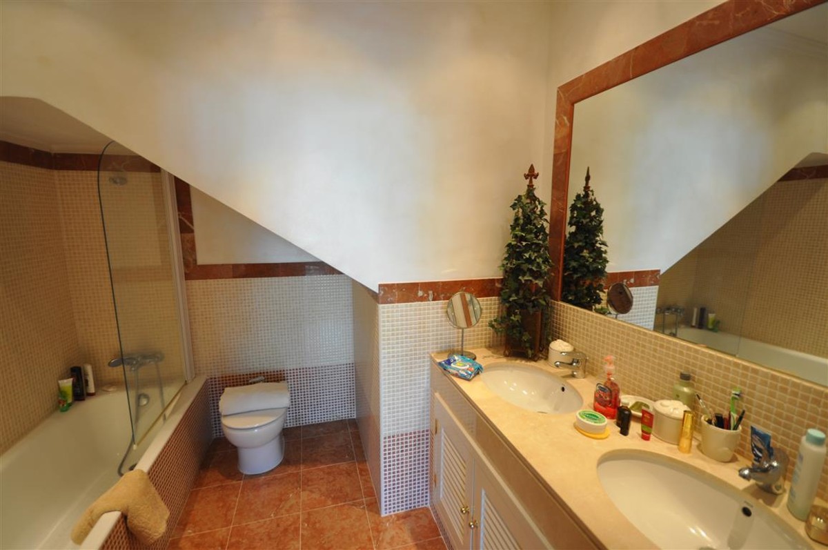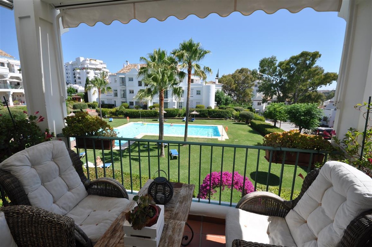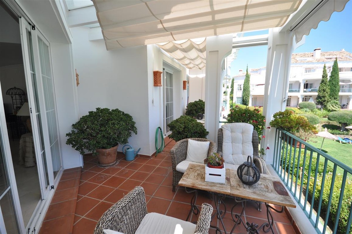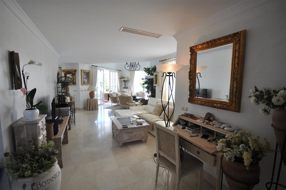 Magnificent corner duplex penthouse apartment. Very light and spacious, enjoying the sun from morning to evening and the beautiful views over the garden and swimming pool. The apartment has been completely reformed using good quality materials combined with exquisite taste. Large open plan kitchen and a spacious living room, with modern fireplace. Plenty of terrace space on the 1st floor, small bodega, 2 bedrooms and 2 bathrooms. On the 2nd level is a large master bedroom with en suite, all surronded by large terraces with shade, some of them with glass curtains. The property is located in a well mantained urbanization with 24h. security, walking distance to the town center and only a very short walk from the club house of Gualdalmina Golf. Under ground parking included.