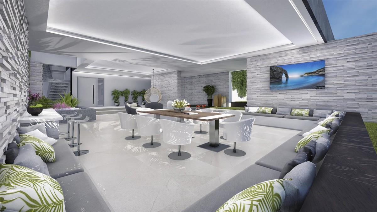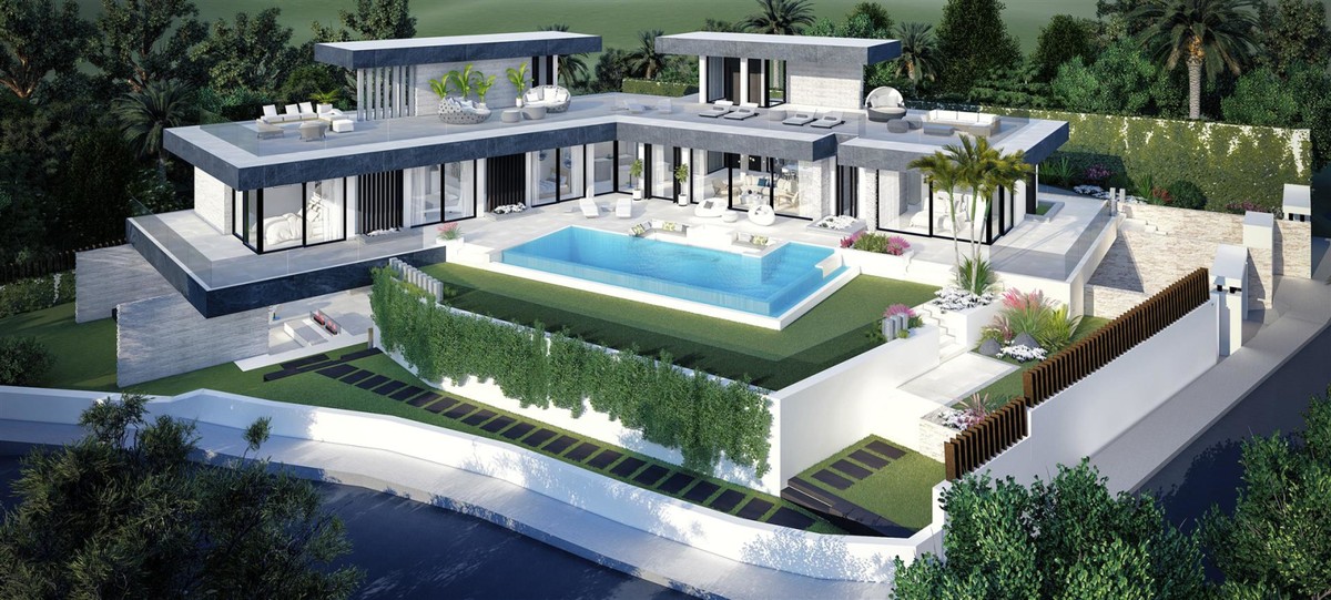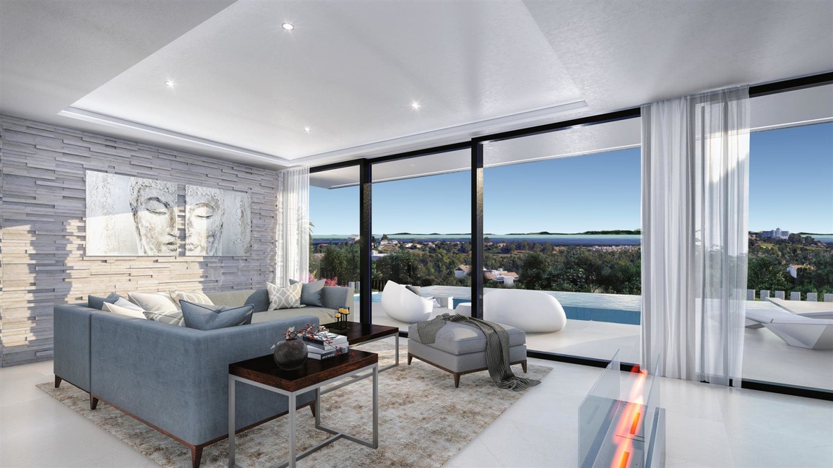 The bottom of the platform offers a practical and useful space with natural light, which is an ideal area for the leisure entertainment needs of the whole family along with a covered terrace for the perfect area of total relaxation. All the qualities we us into our houses are high standard, we only use the best marbles, woods and carpentry for our luxury designs. Our in-house interior designers will work together with you to find the best choices in furniture and finishes. Its angled design divides the bedroom area from the rest of the villa and at the same time integrates the interior with the exterior with the pool being at the heart. The villa offers spacious terraces both covered and uncovered on several levels and at the roof top affording the best views of the coast. The interior of the house has been designed to be fluid and continuous. Designed with different living zones for day and afternoon light according to the sun exposure.